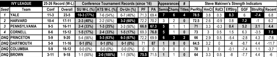 - Ivy League tourney favorites of 4 points or more have gone 12-1 outright (7-5-1 ATS, 58.3%).