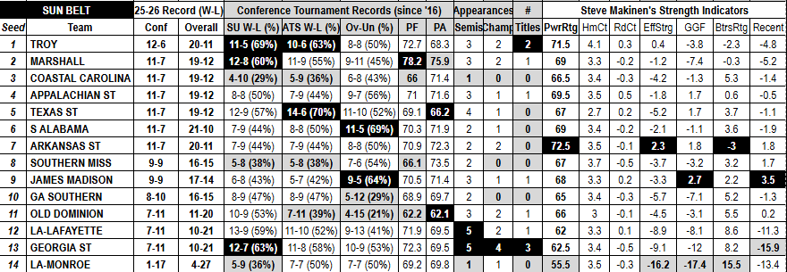 The Sun Belt began this conference tournament format last season and No. 3 seed Troy took down No. 4 seed Arkansas State in the title game. The Trojans are looking to run it back, this time as the favorite and with a bye all the way to the semis. Last year, Troy played No. 10 Old Dominion in the quarters, as the Monarchs reeled off three wins in three days before running out of gas.