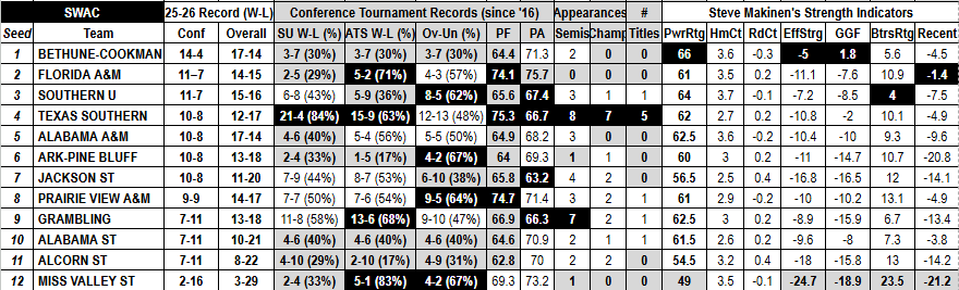 - The SWAC tournament has proven to be quite chalky over the last eight years, with favorites of 3 points or more on a 37-9 SU and 30-14-2 ATS (68.2%) run.