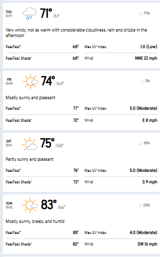 Thursday’s forecast calls for heavy rain along with wind gusts that could reach 45 mph. Additional showers are expected for much of Saturday and Sunday.