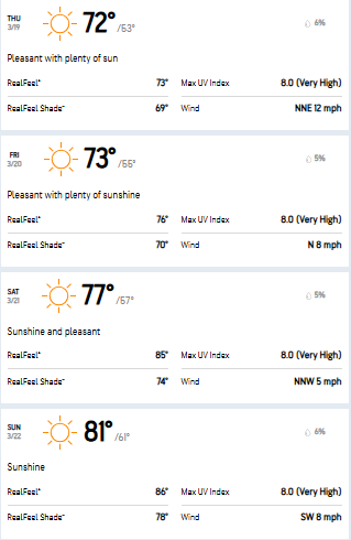 The AccuWeather forecast looks ideal with the wind being strongest on Thursday. There has been little rain in the Tampa/St. Petersburg area in the lead-up, so course conditions should be fairly firm and fast.
