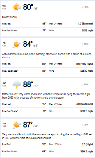 The AccuWeather forecast indicates potential windy conditions in the first two rounds, but also heating up with humid conditions over the weekend.