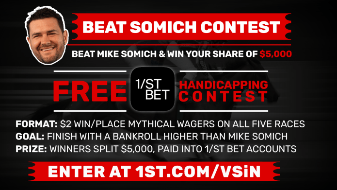If you think you can beat me, today is the day to prove it! Head over to 1st.com/vsin and sign up for the Beat Somich contest! Simply pick five races, and if you end up with a higher bankroll than me, you split $5,000!