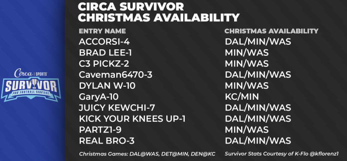 You have one of the 10 Circa Survivor entries, worth $1,871,800. You have to pick a team to win on Christmas Day.