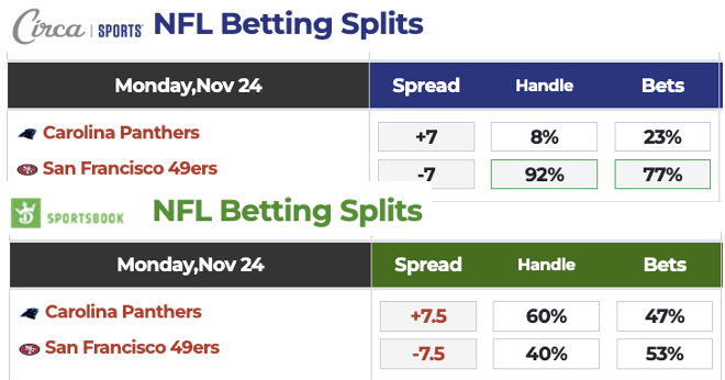 Our VSiN betting splits are interesting heading into this Monday Night Football game. DraftKings Sportsbook opened with San Francisco laying 7, but the 49ers are now 7.5-point favorites there. Meanwhile, Circa Sports opened with San Francisco as 6.5-point favorites, and the book has moved the 49ers to -7.