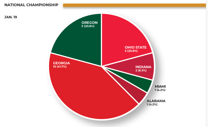 As you can see from the above pie chart on the national championship winner, we had two lone wolves who happen to be co-hosts on the VSiN By The Books (7-10 a.m. ET). Dave Ross went with Alabama and Jensen Lewis picked Miami. Also of note: Proud Indiana grad Wes Reynolds didn’t pick the Hoosiers to win it all and surprisingly strong support for Oregon to make the final.